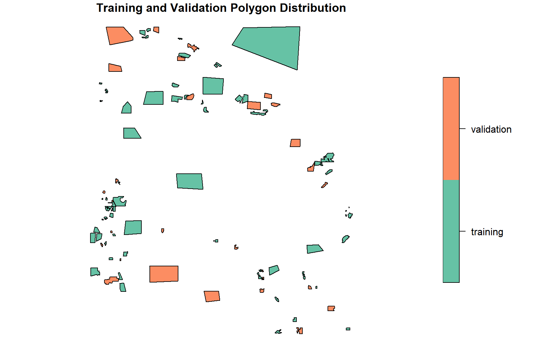 A total of 104 polygons were delineated across seven land cover classes. To ensure an unbiased accuracy assessment, 70% of the polygons in each class were used for training and the remaining 30% were reserved for independent validation.