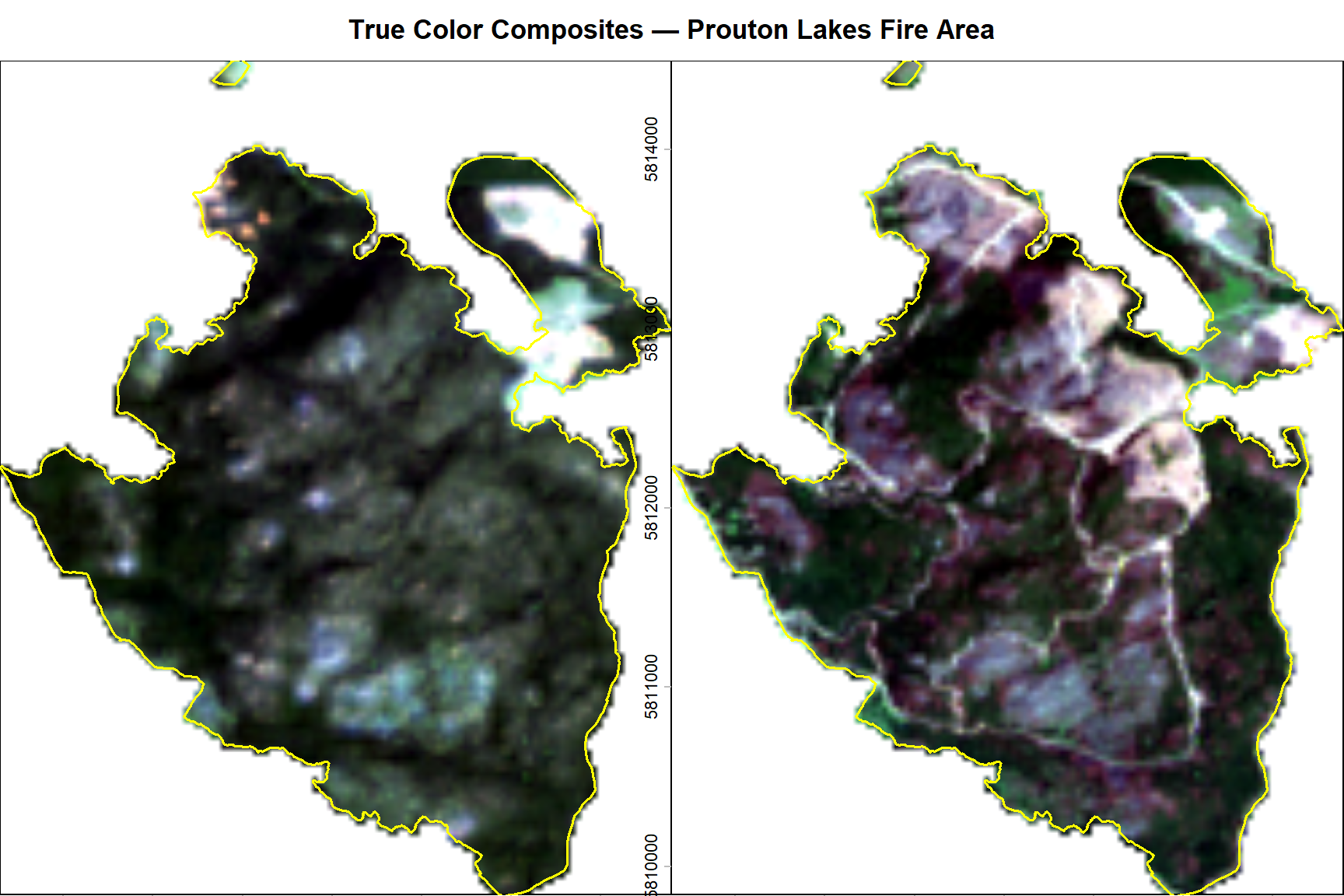- The Prouton Lakes fire (C30870) burned approximately 859.3 hectares, representing a relatively localized but well-documented fire with variable burn severity, making it well-suited for detailed remote sensing analysis.