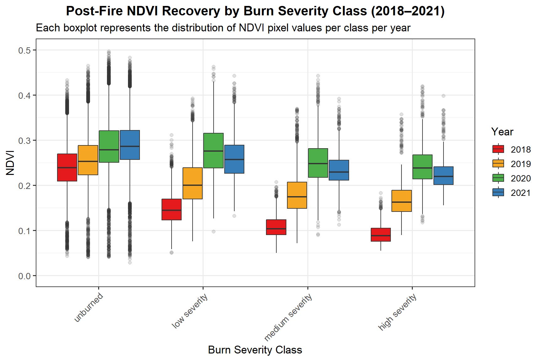 The boxplots confirm a clear and ecologically meaningful pattern: high severity burn areas show the lowest NDVI values in 2018 and the slowest recovery trajectory through 2021. Unburned and low severity areas maintain relatively higher NDVI throughout the post-fire period, consistent with minimal disruption to the existing vegetation structure. The narrowing gap between severity classes from 2018 to 2021 suggests active but gradual recovery, with early successional species beginning to re-establish across the burned landscape.