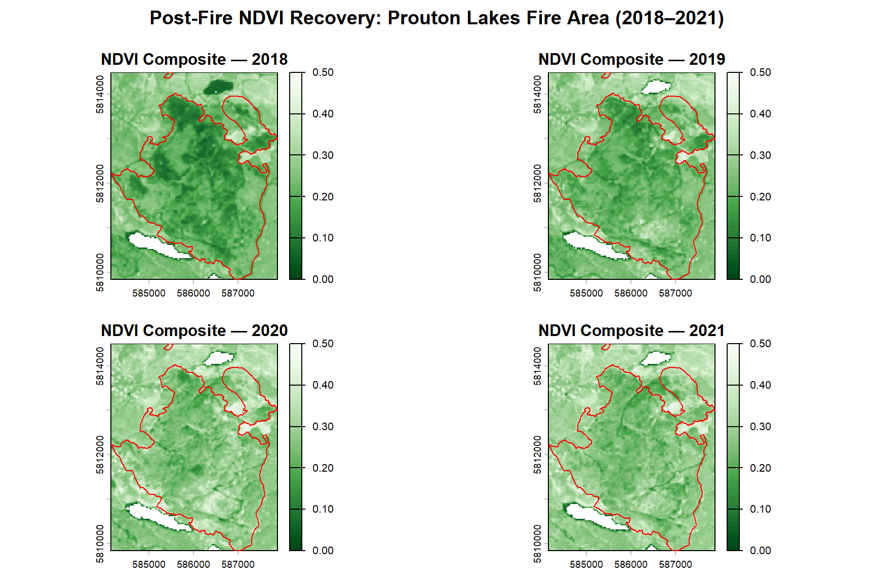mtext("Post-Fire NDVI Recovery: Prouton Lakes Fire Area (2018–2021)",